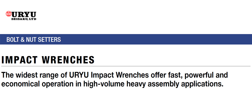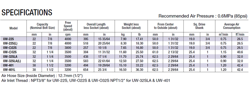 URYU IMPACT WRENCHES (SHORT) UW-22S, Bolt Size 22mm, 4000 RPM, Drive Shank 19mm, Air Wrench
