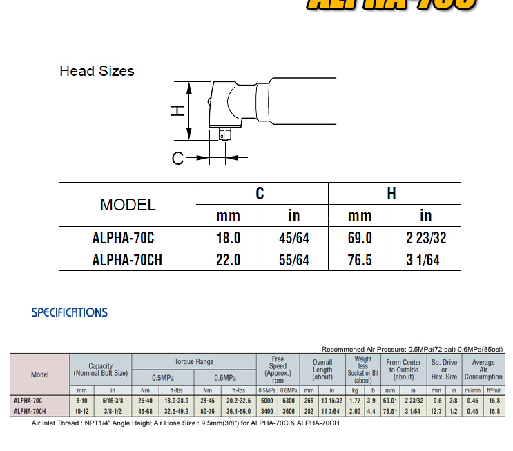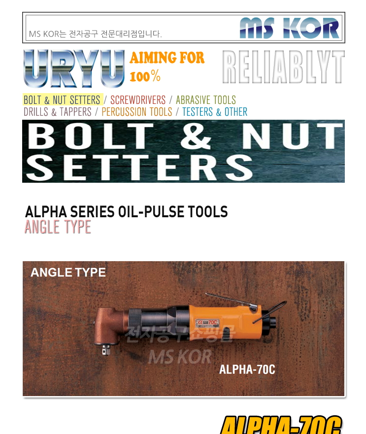 URYU OIL-PULSE Driver (ANGLE-TYPE) ALPHA-70C, Torque Range 25~40, 28~45Nm, Bolt Size 8~10mm, 6000, 6300 RPM, Hex Size 9.5mm, Air Wrench, Screwdriver
