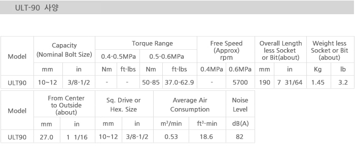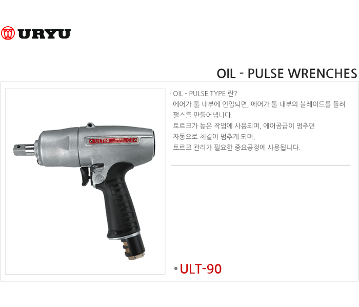URYU OIL-PULSE TOOL (SHUT-OFF, Pistol Type) ULT90, Torque Range 750.0~85.0Nm, Bolt Size 10~12mm, 5700 RPM, Hex Size 10~12mm