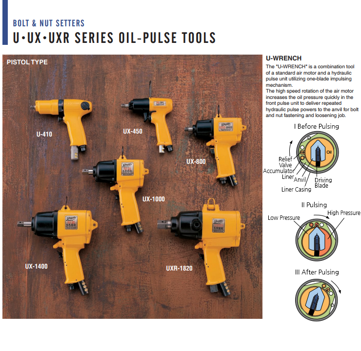 URYU OIL-PULSE TOOL (PISTOL-TYPE) UX-500D, Torque Range 11~17, 8~14Nm, Bolt Size 13~20mm,9000, 9300 RPM, Hex Size 6.35mm, Air Wrench
