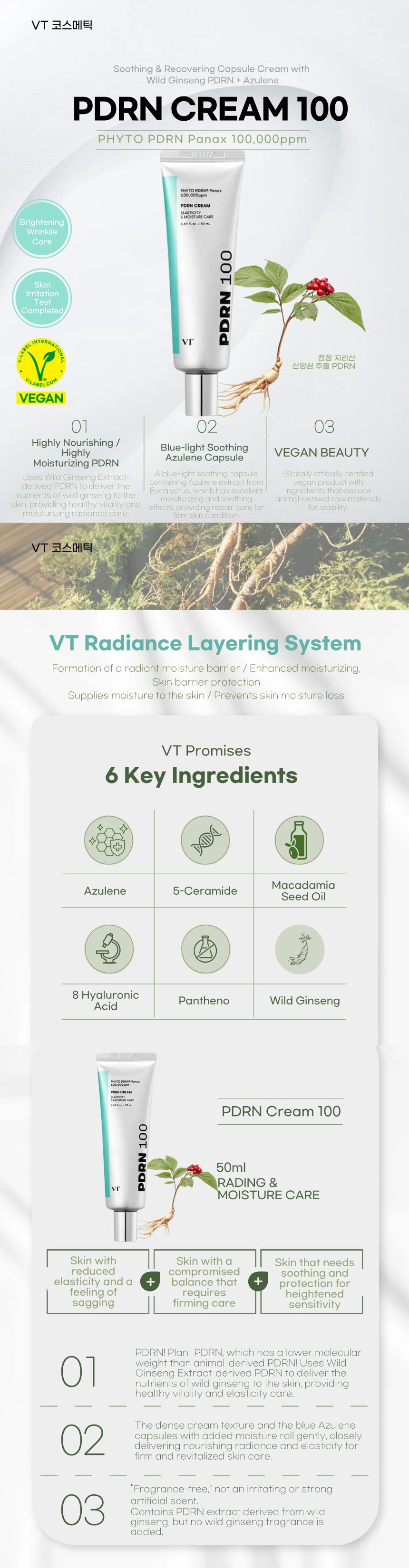 [VT Cosmetics] Wild Ginseng PDRN Cream 100, 50ml | Vegan PDRN & Azulene Soothing Capsule | Dual Functional Anti-Aging Cream _ Made in Korea