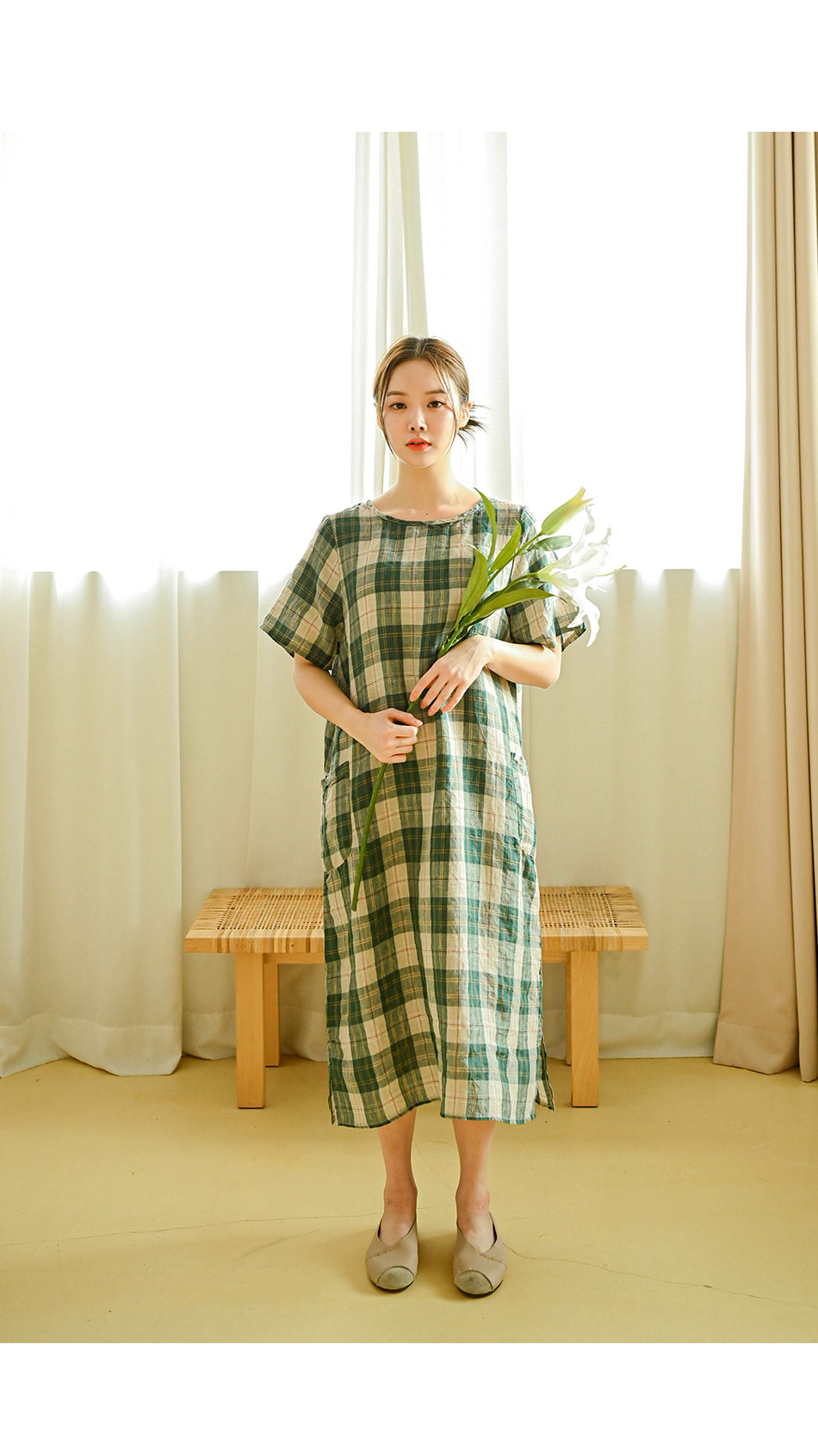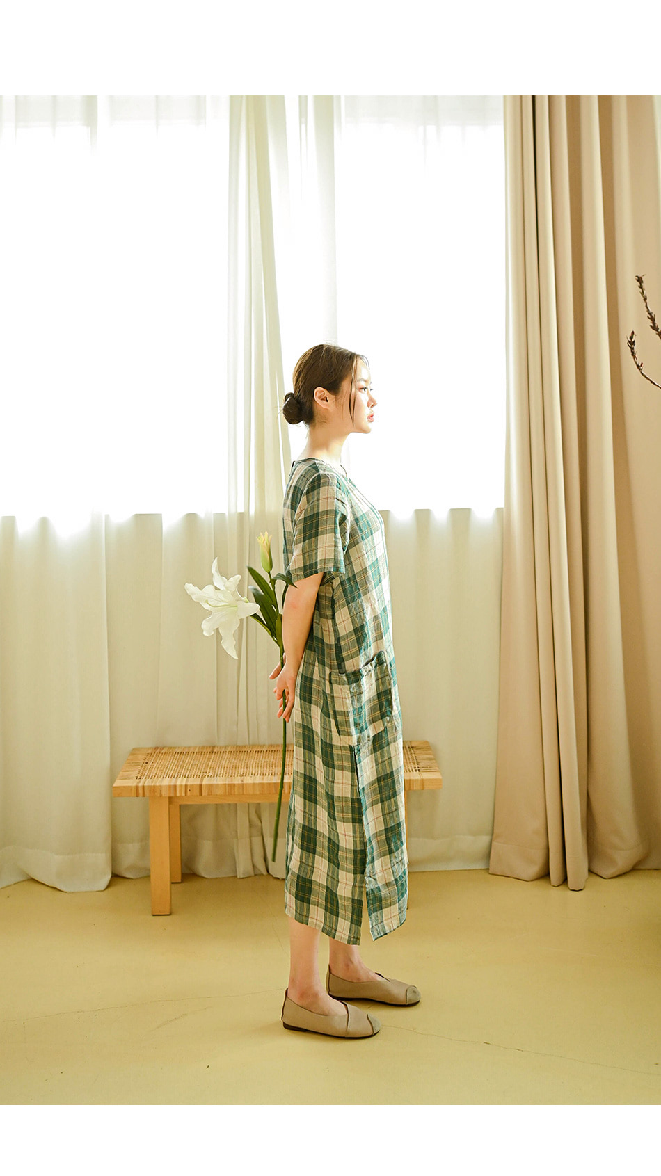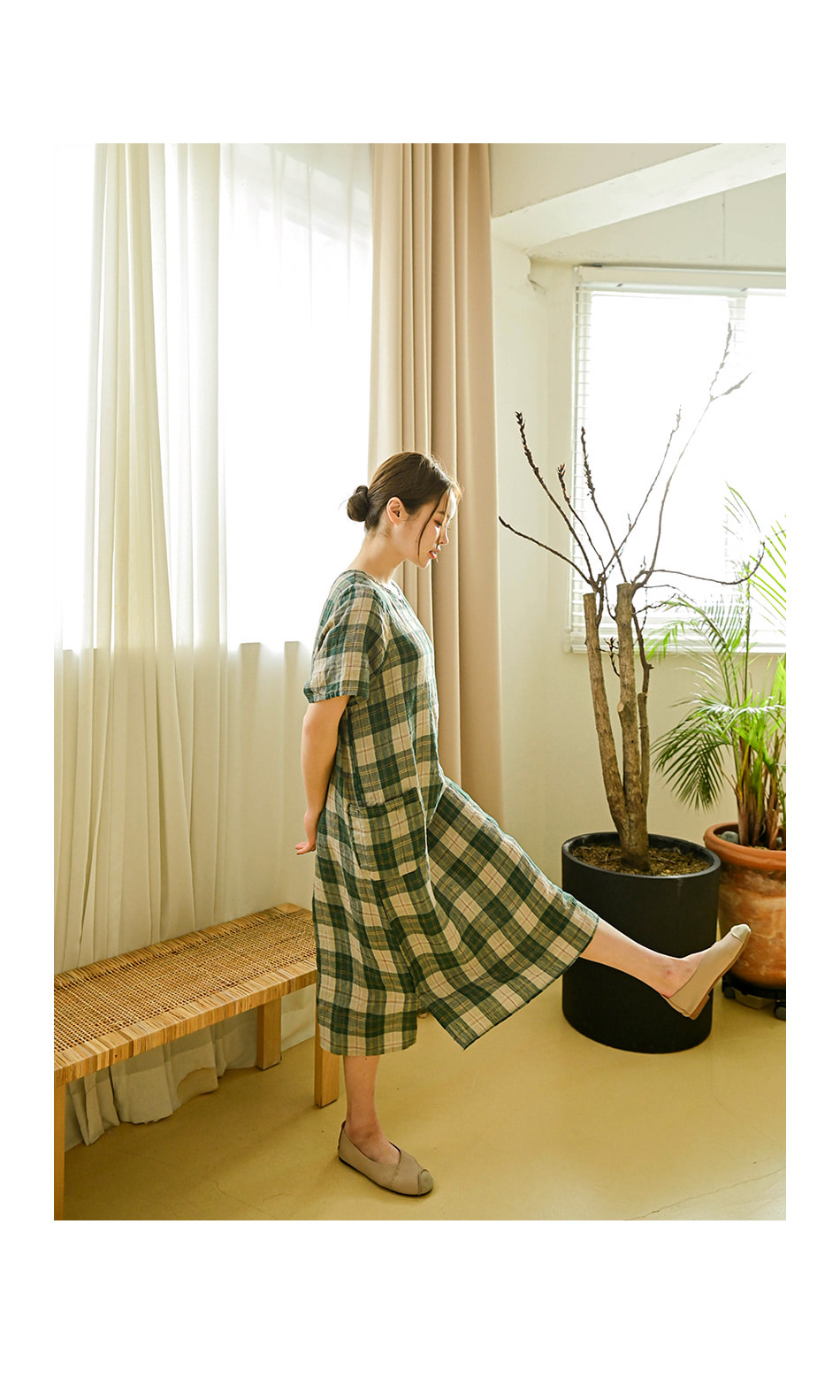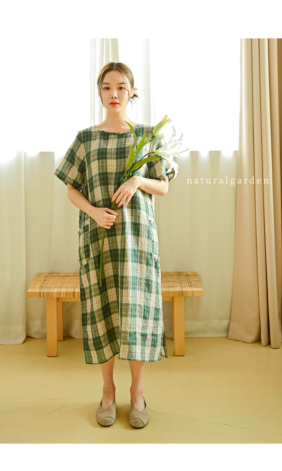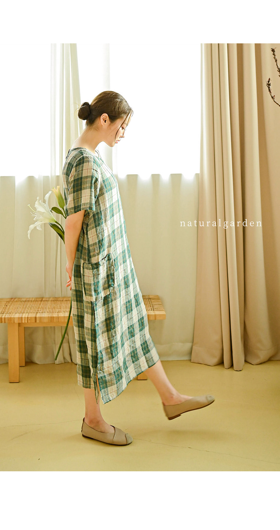 [Natural Garden] MADE N Side pocket check short sleeve linen dress_High quality material, light linen material_ Made in KOREA