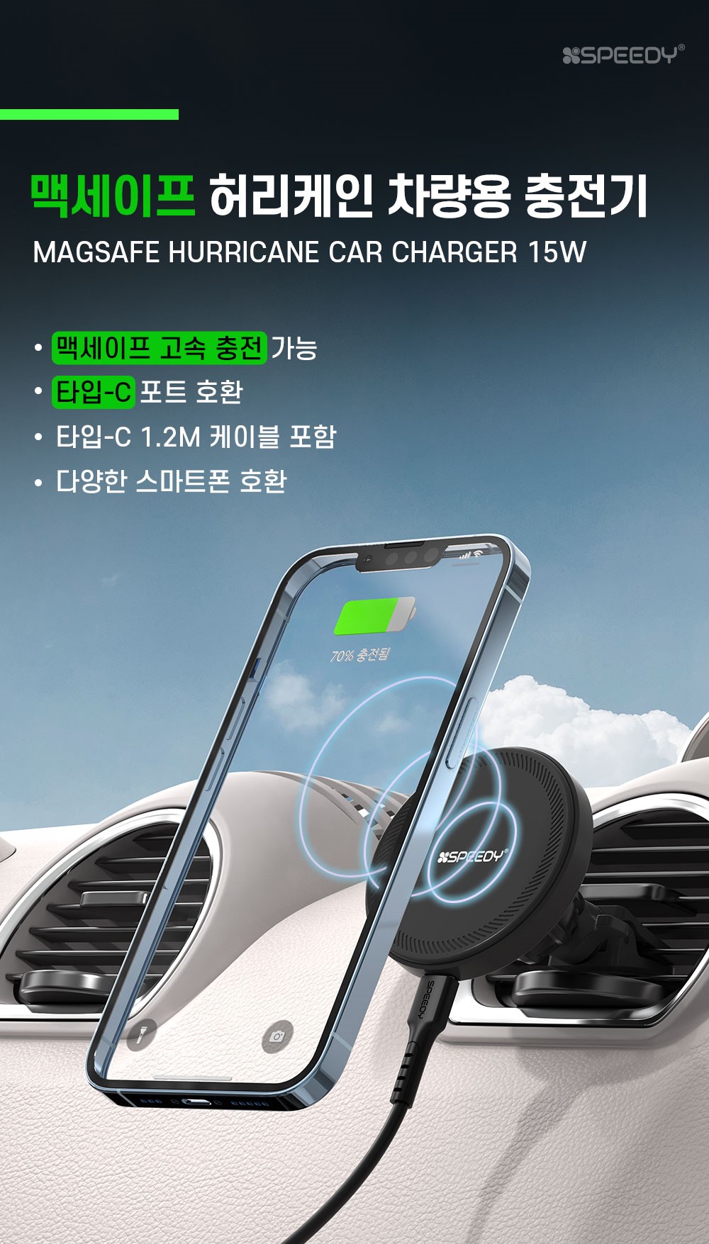 [S2B] SPEEDY Magsafe Hurricane Car Charger 15W _ with Type-C Cable, 360° Adjustable Air Vent Holder, Wireless Charging Phone Holder Compatible with iPhone Samsung Galaxy